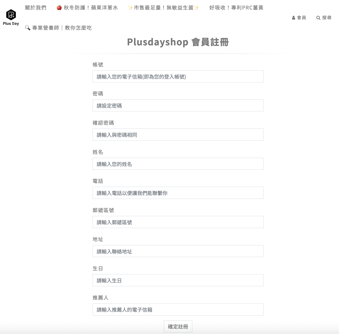 步驟1. 點選官網右上角會員或是點此連結(https://www.plusdayshop.com/user/regedit)進入會員註冊畫面